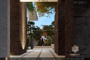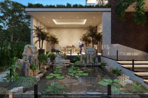 Không chỉ tập trung vào không gian bên trong, căn biệt thự mái bằng hiện đại này còn chú trọng đến khu vực ngoại thất. Với sân vườn xanh mát, hòn non bộ và hồ cá, gia đình có thể thư giãn và tận hưởng không gian ngoài trời tại chính ngôi nhà của mình.