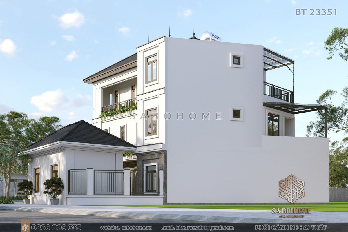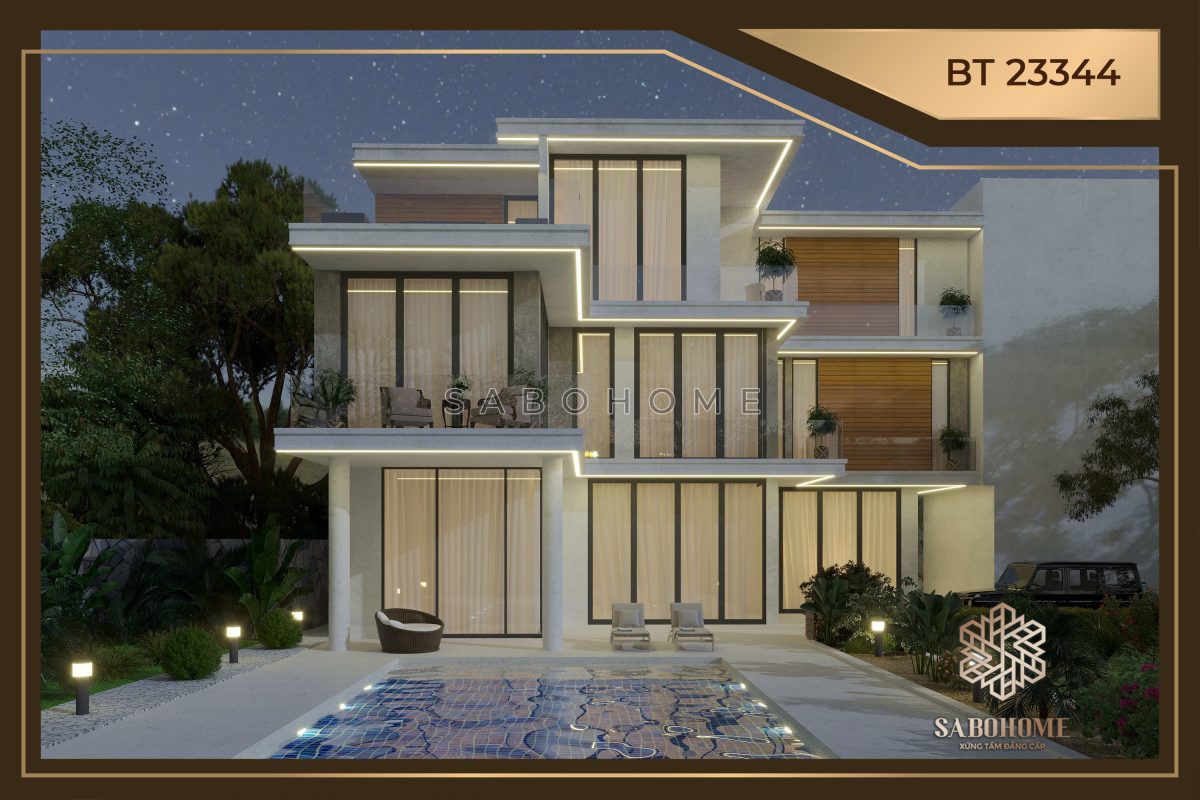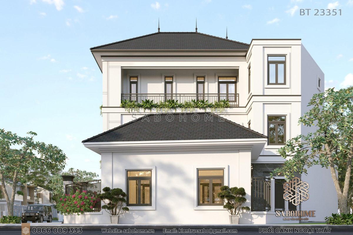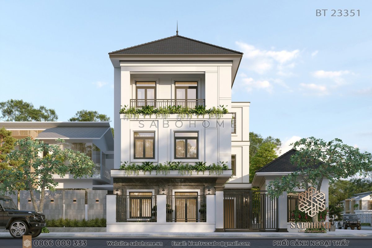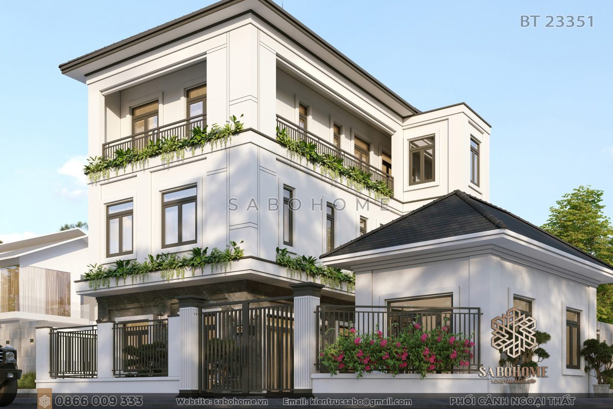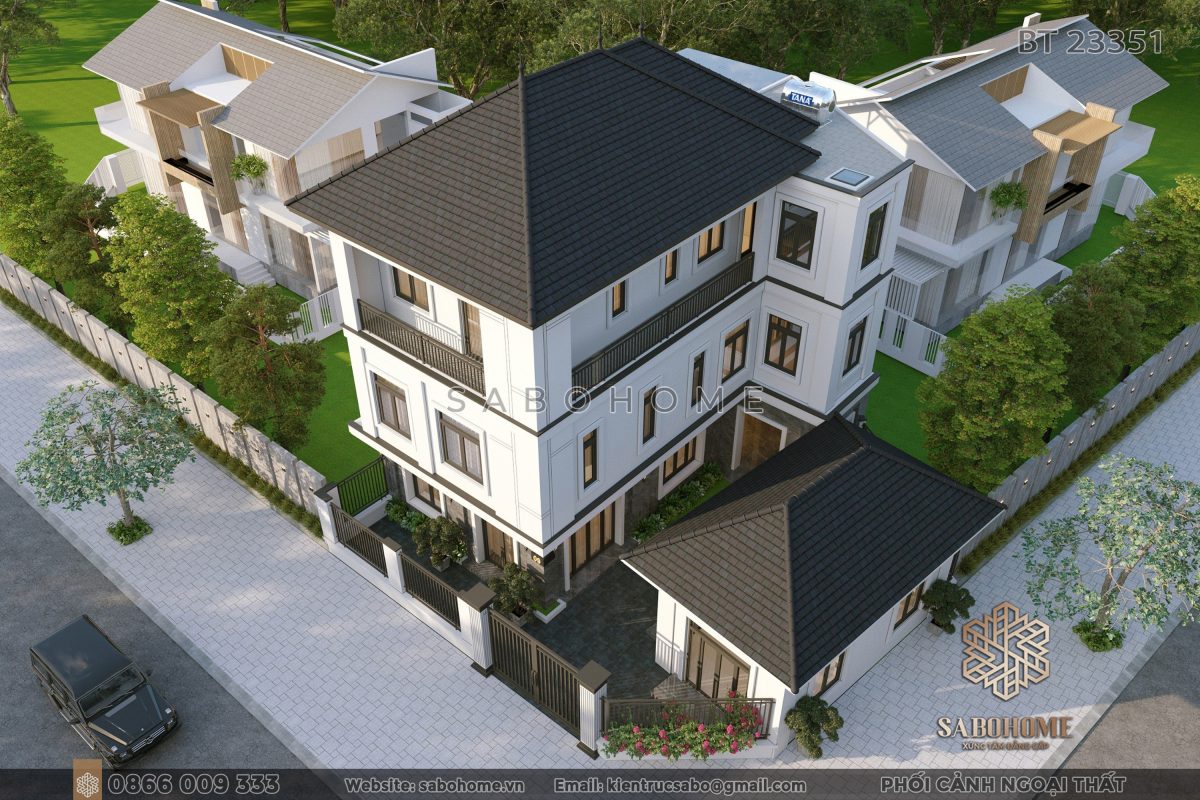 Biệt thự BT23351 có thiết kế biệt thự 3 tầng hiện đại. Nó mang lại vẻ đẹp thanh lịch và tinh tế. Kiến trúc kiến trúc biệt thự tối giản làm cho biệt thự trông sang trọng và hiện đại. Đồng thời, nó cung cấp không gian mở rộng rãi biệt thự cho gia chủ.