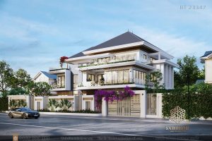 Biệt thự có thiết kế kiến trúc mái nhật độc đáo. Mang lại phong cách kiến trúc hiện đại và thiết kế sang trọng. Các đường nét tinh tế và vật liệu chất lượng cao làm nên một tổng thể ấn tượng và độc đáo.