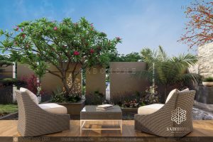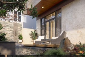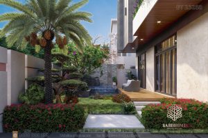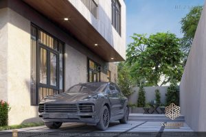 Biệt thự 3 tầng hiện đại mái Nhật tại Hải Phòng được bao quanh bởi một khu vườn xanh mát và có không gian ngoại thất đẹp mắt. Khu vườn được thiết kế với cây xanh, cỏ và sân vườn, tạo ra một môi trường gần gũi với thiên nhiên và tạo điểm nhấn cho không gian sống. Gia đình có thể tận hưởng không gian ngoài trời, tổ chức các buổi tiệc ngoài trời hay thư giãn sau một ngày làm việc căng thẳng. Ngoài ra, biệt thự còn có không gian để đậu xe và sân chơi cho trẻ em, đáp ứng đầy đủ nhu cầu vui chơi và sinh hoạt của gia đình.