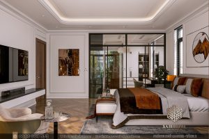 Phòng ngủ master hiện đại không chỉ đẹp mắt mà còn tận dụng mọi không gian thông minh và tiện ích. Kệ để đồ được tích hợp sẵn vào tường, tủ âm tường, không gian để làm việc và góc ngồi riêng đều được xây dựng để đáp ứng các nhu cầu của chủ nhân.