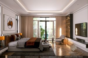 Thiết kế phòng ngủ master hiện đại tại Thái Nguyên tạo cầu nối với thiên nhiên bên ngoài. Sử dụng cửa sổ lớn và ban công rộng, không gian phòng ngủ kết nối hài hòa với không gian xanh bên ngoài. Tầm nhìn ra khu vườn hay những ngọn đồi xanh mướt tạo nên cảm giác gần gũi với thiên nhiên và thúc đẩy sự thư thái và sự cân bằng tâm hồn.