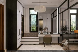 Phòng ngủ master hiện đại ở Thái Nguyên được thiết kế với những chi tiết tinh tế, từ giường ngủ sang trọng đến các món đồ nội thất như ghế, bàn trang điểm và tủ quần áo. Sự kết hợp hoàn hảo giữa các yếu tố như chất liệu, màu sắc và hình dáng tạo nên một không gian thẩm mỹ và đẳng cấp.